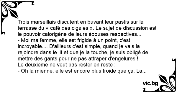 Trois marseillais discutent en buvant leur pastis sur la terrasse du « café des cigales ». Le sujet de discussion est le pouvoir calorigène de leurs épouses respectives...