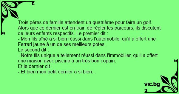 Trois pères de famille attendent un quatrième pour faire un golf. Alors que ce dernier est en train de régler les parcours, ils discutent de leurs enfants respectifs. Le premier dit :
