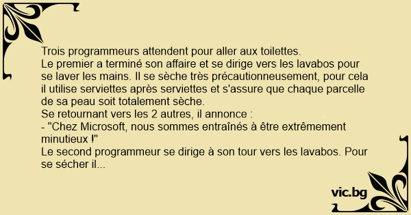 Le second programmeur se dirige à son tour vers les lavabos. Pour se sécher il prend une seule serviette, et fait en sorte que chaque parcelle de la serviette soit rentabilisée.