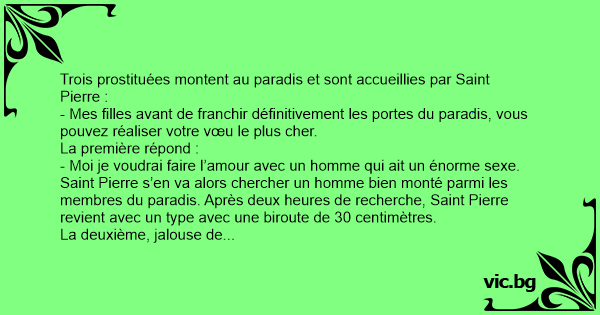 Saint Pierre s’en va alors chercher un homme bien monté parmi les membres du paradis. Après deux heures de recherche, Sаinт Pierre revient avec un type avec une biroute de 30 centimètres.