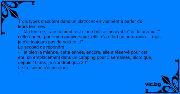 - " Ma femme, franchement, est d'une bêtise incroyable" dit le premier " cette année, pour mon anniversaire, elle m'a offert un auto-radio... mais je n'ai toujours pas de voiture...!"