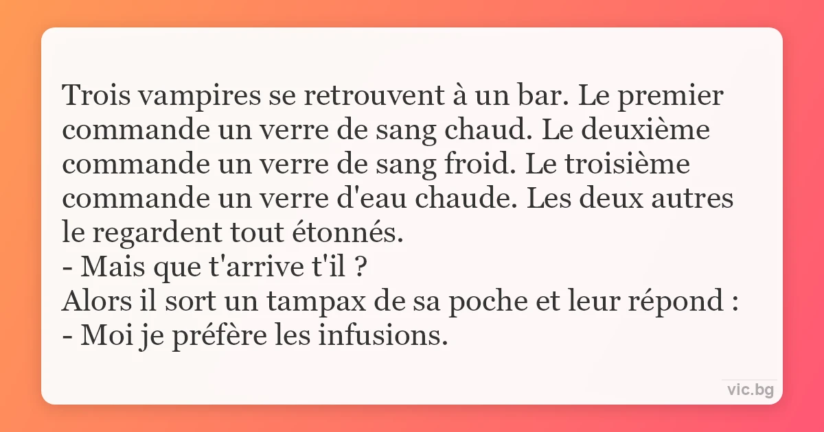 Trois vampires se retrouvent à un bar. Le premier commande un verre de sang chaud. Le deuxième commande un verre de sang froid. Le troisième commande un verre d'eau chaude. Les deux autres le regardent tout étonnés.