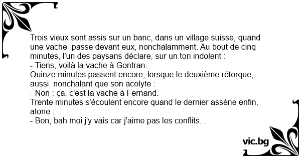 Trois vieux sont assis sur un banc, dans un village suisse, quand une vache passe devant eux, nonchalamment. Au bout de cinq minutes, l'un des paysans déclare, sur un ton indolent :