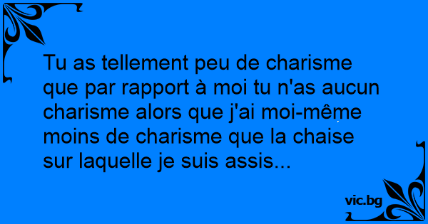 Tu as tellement peu de charisme que par rapport à moi tu n'as aucun charisme alors que j'ai moi-même moins de charisme que la chaise sur laquelle je suis assis...