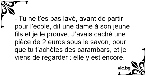 - Tu ne t’es pas lavé, avant de partir pour l’école, dit une dame à son jeune fils et je le prouve. J’avais caché une pièce de 2 euros sous le savon, pour que tu t’achètes des carambars, et je viens de regarder : elle y est encore.