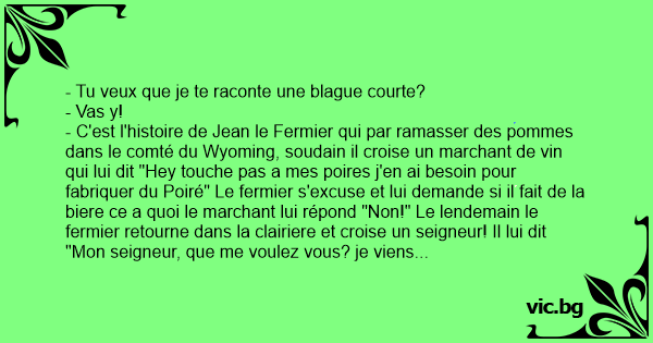 - C'est l'histoire de Jean le Fermier qui par ramasser des pommes dans le comté du Wyoming, soudain il croise un marchant de vin qui lui dit "Hey touche pas a mes poires j'en ai besoin pour fabriquer du Poiré" Le fermier s'excuse et lui demande si il fait de la biere ce a quoi le marchant lui répond "Non!" Le lendemain le fermier retourne dans la clairiere et croise un seigneur! Il lui dit "Mon seigneur, que me voulez vous? je viens juste ramasser des pommes pour faire du poiré!" le seigneur le regarde de haut en bas et lui dit "Je t'épargne la vie si tu trouves mon nom!"