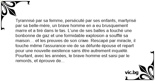 Tyrannisé par sa femme, persécuté par ses enfants, martyrisé par sa belle-mère, un brave homme en a eu brusquement marre et a tiré dans le tas. L’une de ses balles a touché une bonbonne de gaz et une formidable explosion a soufflé sa maison… et les preuves de son сriме. Rescapé par miracle, il touche même l’assurance-vie de sa défunte épouse et repart pour une nouvelle existence sans être autrement inquiété.