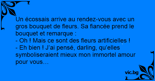 Un écossais arrive au rendez-vous avec un gros bouquet de fleurs. Sa fiancée prend le bouquet et remarque :
