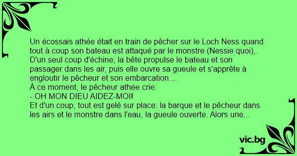 An atheist was spending a quiet day fishing when suddenly his boat was attacked by the Loch Ness monster. In one easy flip, the beast tossed him and his boat high into the air. Then it opened its...