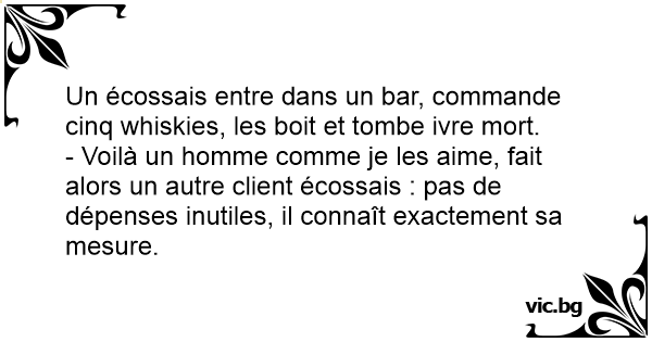 Un écossais entre dans un bar, commande cinq whiskies, les boit et tombe ivre mort.