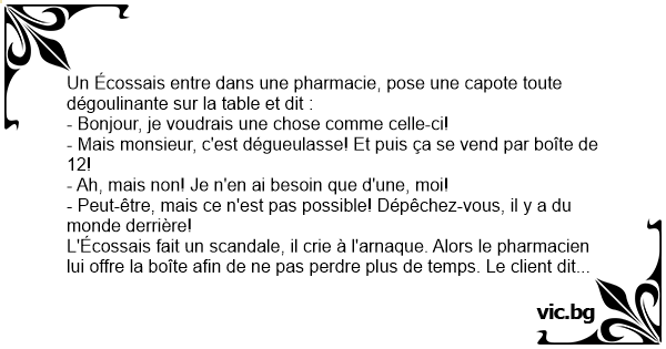 Un Écossais entre dans une pharmacie, pose une capote toute dégoulinante sur la table et dit :