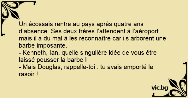 Un écossais rentre au pays après quatre ans d’absence. Ses deux frères l’attendent à l’aéroport mais il a du mal à les reconnaître car ils arborent une barbe imposante.