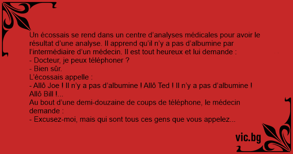Un écossais se rend dans un centre d’analyses médicales pour avoir le résultat d’une analyse. Il apprend qu’il n’y a pas d’albumine par l’intermédiaire d’un médecin. Il est tout heureux et lui demande :