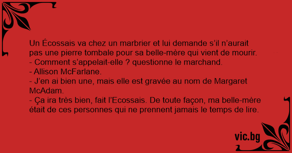 Un Écossais va chez un marbrier et lui demande s’il n’aurait pas une pierre tombale pour sa belle-mère qui vient de mourir.
