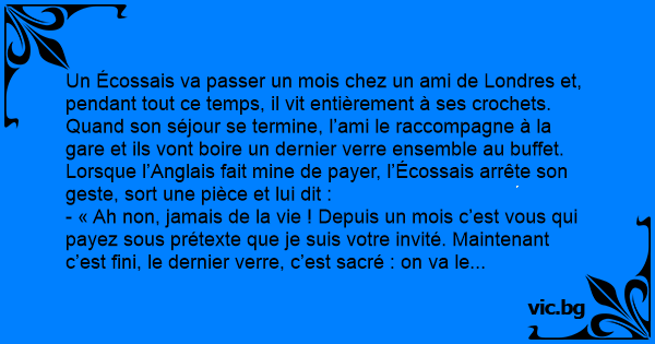 Un Écossais va passer un mois chez un ami de Londres et, pendant tout ce temps, il vit entièrement à ses crochets. Quand son séjour se termine, l’ami le raccompagne à la gare et ils vont boire un dernier verre ensemble au buffet. Lorsque l’Anglais fait mine de payer, l’Écossais arrête son geste, sort une pièce et lui dit :