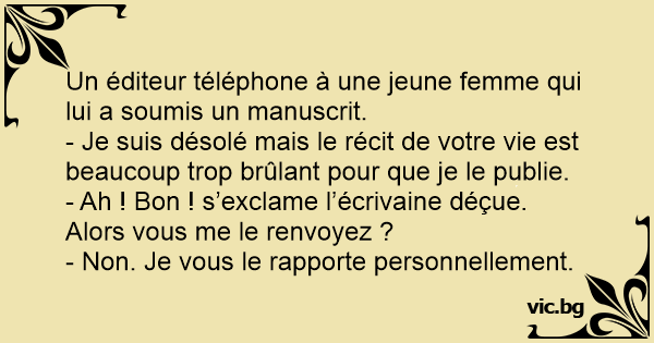 - Ah ! Bon ! s’exclame l’écrivaine déçue. Alors vous me le renvoyez ?