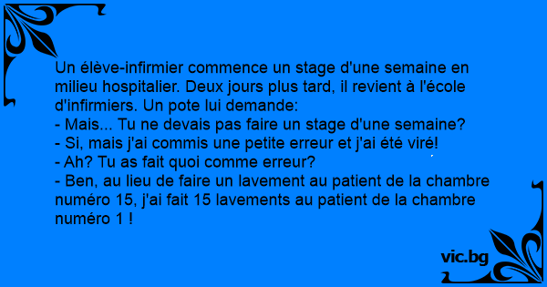 Un élève-infirmier commence un stage d'une semaine en milieu hospitalier. Deux jours plus таrd, il revient à l'école d'infirmiers. Un pote lui demande: