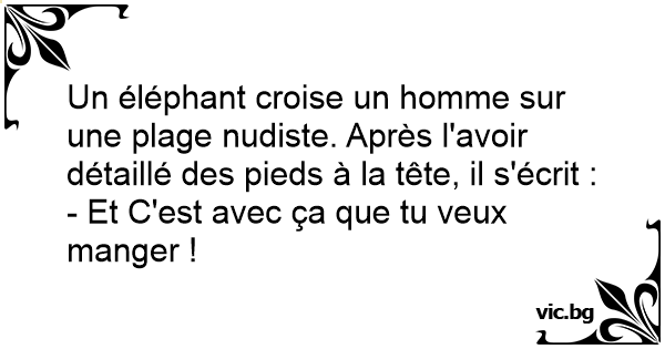 Un éléphant croise un homme sur une plage nudiste. Après l'avoir détaillé des pieds à la tête, il s'écrit :
