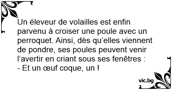 Un éleveur de volailles est enfin parvenu à croiser une poule avec un perroquet. Ainsi, dès qu’elles viennent de pondre, ses poules peuvent venir l’avertir en criant sous ses fenêtres :