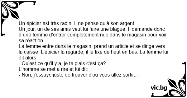 La femme entre dans le magasin, prend un article et se dirige vers la caisse. L'épicier la regarde, il la fixe de haut en bas. La femme lui dit alors: