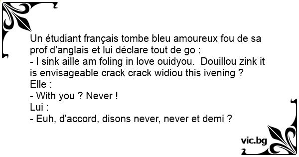 Un étudiant français tombe bleu amoureux fou de sa prof d'anglais et lui déclare tout de go :