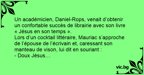 Lors d’un cocktail littéraire, Mauriac s’approche de l’épouse de l’écrivain et, caressant son manteau de vison, lui dit en souriant :