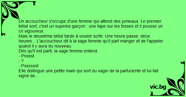 Mais le deuxième bébé tarde à vouloir sortir. Une heure passe, deux heures... L'accoucheur dit à la sage femme qu'il part manger et de l'appeler quand il y aura du nouveau.