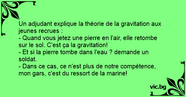 Un adjudant explique la théorie de la gravitation aux jeunes recrues : - Quand vous jetez une pierre en l'air, elle retombe sur le sol. C'est ça la gravitation! - Et si la pierre tombe dans l'eau ? demande un soldat. - Dans ce cas, ce n'est plus de notre compétence, mon gars, c'est du ressort de la marine!