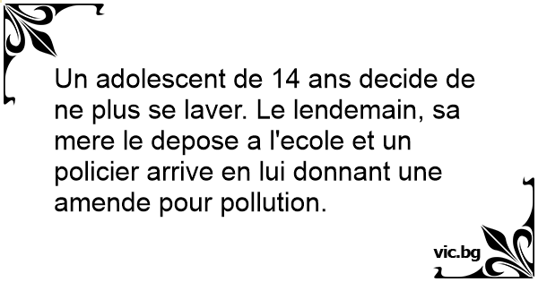 Un adolescent de 14 ans decide de ne plus se laver. Le lendemain, sa mere le depose a l'ecole et un policier arrive en lui donnant une amende pour pollution.