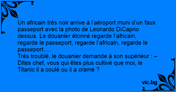 Un africain très noir arrive à l’aéroport muni d’un faux passeport avec la photo de Leonardo DiCaprio dessus. Le douanier étonné regarde l’africain, regarde le passeport, regarde l’africain, regarde le passeport….