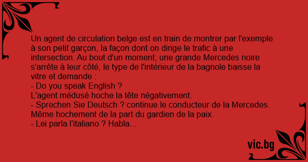 Un agent de circulation belge est en train de montrer par l'exemple à son petit garçon, la façon dont on dirige le trafic à une intersection. Au bout d'un moment, une grande Mercedes noire s'arrête à leur côté, le type de l'intérieur de la bagnole baisse la vitre et demande :