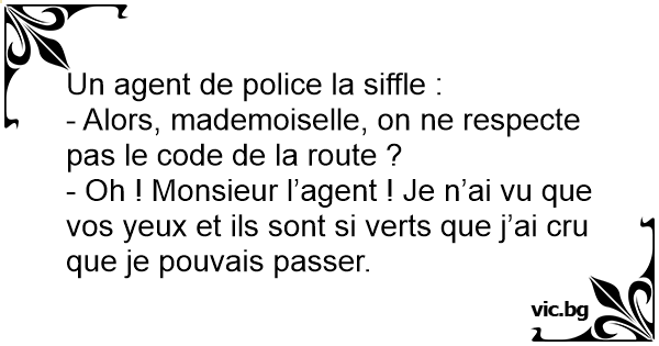 - Oh ! Monsieur l’agent ! Je n’ai vu que vos yeux et ils sont si verts que j’ai cru que je pouvais passer.