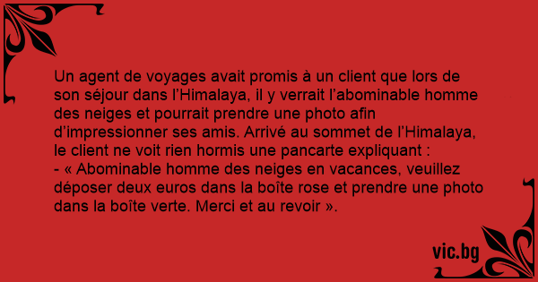 Un agent de voyages avait promis à un client que lors de son séjour dans l’Himalaya, il y verrait l’abominable homme des neiges et pourrait prendre une photo afin d’impressionner ses amis. Arrivé au sommet de l’Himalaya, le client ne voit rien hormis une pancarte expliquant :