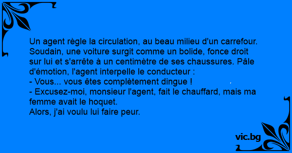 - Excusez-moi, monsieur l'agent, fait le chauffard, mais ma femme avait le hoquet.