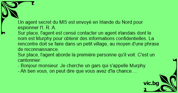 - Ah ben vous, on peut dire que vous avez d'la chance. Dans l'village, le boucher s'appelle Murphy, le boulanger s'appelle Murphy, trois femmes du village sont veuves d'un Murphy, moi-même, je m'appelle Murphy... y a des tas de Murphy par ici!