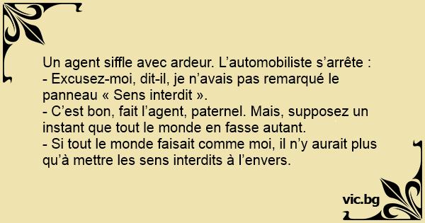 - Excusez-moi, dit-il, je n’avais pas remarqué le panneau « Sens interdit ».