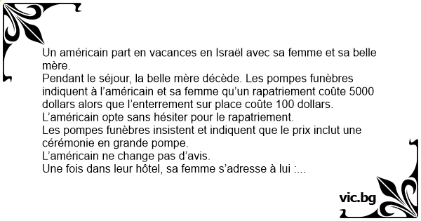 Pendant le séjour, la belle mère décède. Les pompes funèbres indiquent à l’américain et sa femme qu’un rapatriement coûte 5000 dollars alors que l’enterrement sur place coûte 100 dollars.