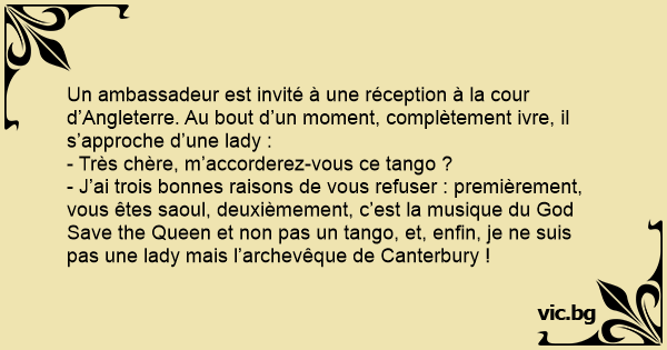- J’ai trois bonnes raisons de vous refuser : premièrement, vous êtes saoul, deuxièmement, c’est la musique du God Save the Queen et non pas un tango, et, enfin, je ne suis pas une lady mais l’archevêque de Canterbury !