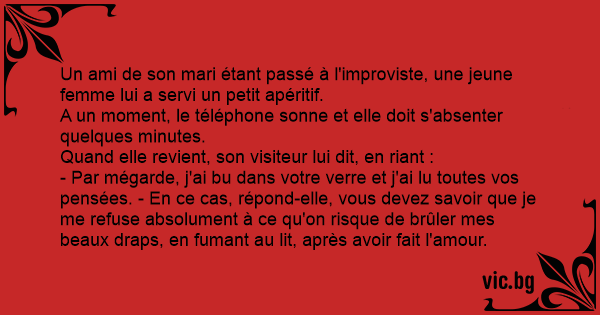 - Par mégarde, j'ai bu dans votre verre et j'ai lu toutes vos pensées. - En ce cas, répond-elle, vous devez savoir que je me refuse absolument à ce qu'on risque de brûler mes beaux draps, en fumant au lit, après avoir fait l'amour.