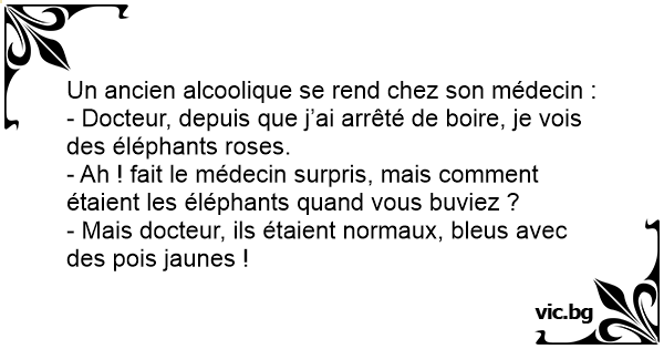 - Docteur, depuis que j’ai arrêté de boire, je vois des éléphants roses.
