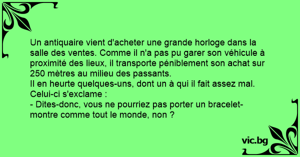 Un antiquaire vient d'acheter une grande horloge dans la salle des ventes. Comme il n'a pas pu garer son véhicule à proximité des lieux, il transporte péniblement son achat sur 250 mètres au milieu des passants.