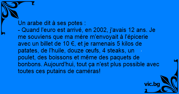 - Quand l'euro est arrivé, en 2002, j'avais 12 ans. Je me souviens que ma mère m'envoyait à l'épicerie avec un billet de 10 €, et je ramenais 5 kilos de patates, de l'huile, douze œufs, 4 steaks, un poulet, des boissons et même des paquets de bonbons. Aujourd'hui, tout ça n'est plus possible avec toutes ces putains de caméras!