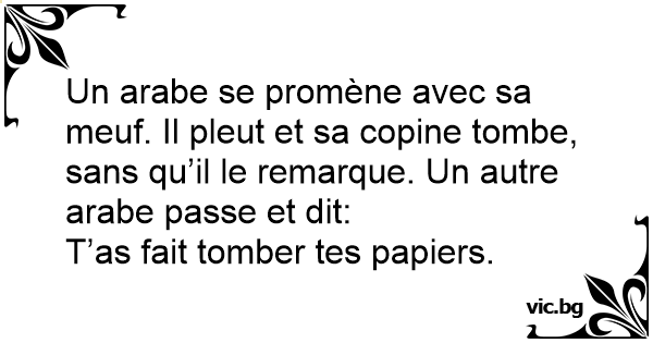 Un arabe se promène avec sa meuf. Il pleut et sa copine tombe, sans qu’il le remarque. Un autre arabe passe et dit: