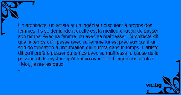 Un architecte, un artiste et un ingénieur discutent à propos des femmes. Ils se demandent quelle est la meilleure façon de passer son temps: Avec sa femme, ou avec sa maîtresse. L'architecte dit que le temps qu'il passe avec sa femme lui est précieux car il lui sert de fondation à une relation qui durera dans le temps. L'artiste dit qu'il préfère passer du temps avec sa maîtresse, à cause de la passion et du mystère qu'il trouve avec elle. L'ingénieur dit alors :