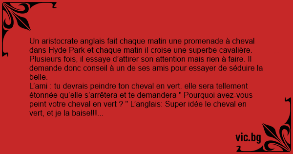 L’ami : tu devrais peindre ton cheval en vert. elle sera tellement étonnée qu’elle s’arrêtera et te demandera " Pourquoi avez-vous peint votre cheval en vert ? " L’anglais: Super idée le cheval en vert, et je la baise!!!