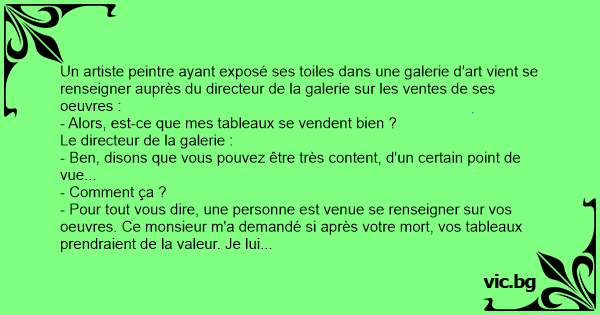 - Pour tout vous dire, une personne est venue se renseigner sur vos oeuvres. Ce monsieur m'a demandé si après votre mort, vos tableaux prendraient de la valeur. Je lui ai répondu "Très certainement". Alors il a tout de suite acheté tous les tableaux signés de votre nom.