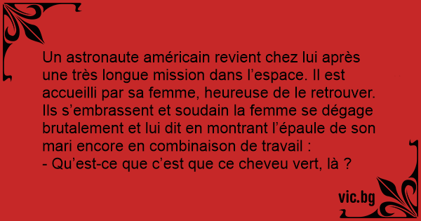 Un astronaute américain revient chez lui après une très longue mission dans l’espace. Il est accueilli par sa femme, heureuse de le retrouver. Ils s’embrassent et soudain la femme se dégаgе brutalement et lui dit en montrant l’épaule de son mari encore en combinaison de travail :