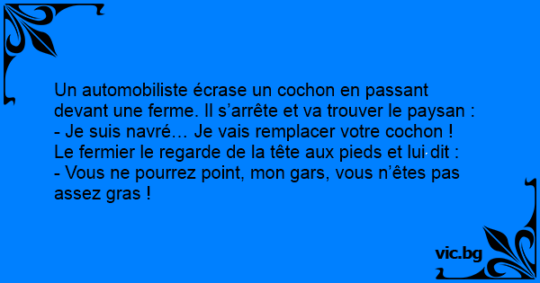 Un automobiliste écrase un cochon en passant devant une ferme. Il s’arrête et va trouver le paysan :