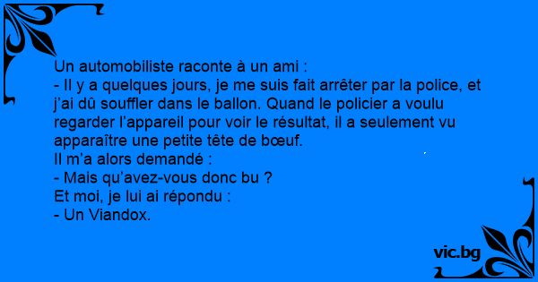 - Il y a quelques jours, je me suis fait arrêter par la police, et j’ai dû souffler dans le ballon. Quand le policier a voulu regarder l’appareil pour voir le résultat, il a seulement vu apparaître une petite tête de bœuf.