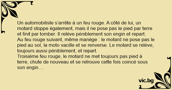 Troisième feu rouge, le motard ne met toujours pas pied à terre, chute de nouveau et se retrouve cette fois coincé sous son engin. L’automobiliste descend, l’aide à se relever, et lui dit :